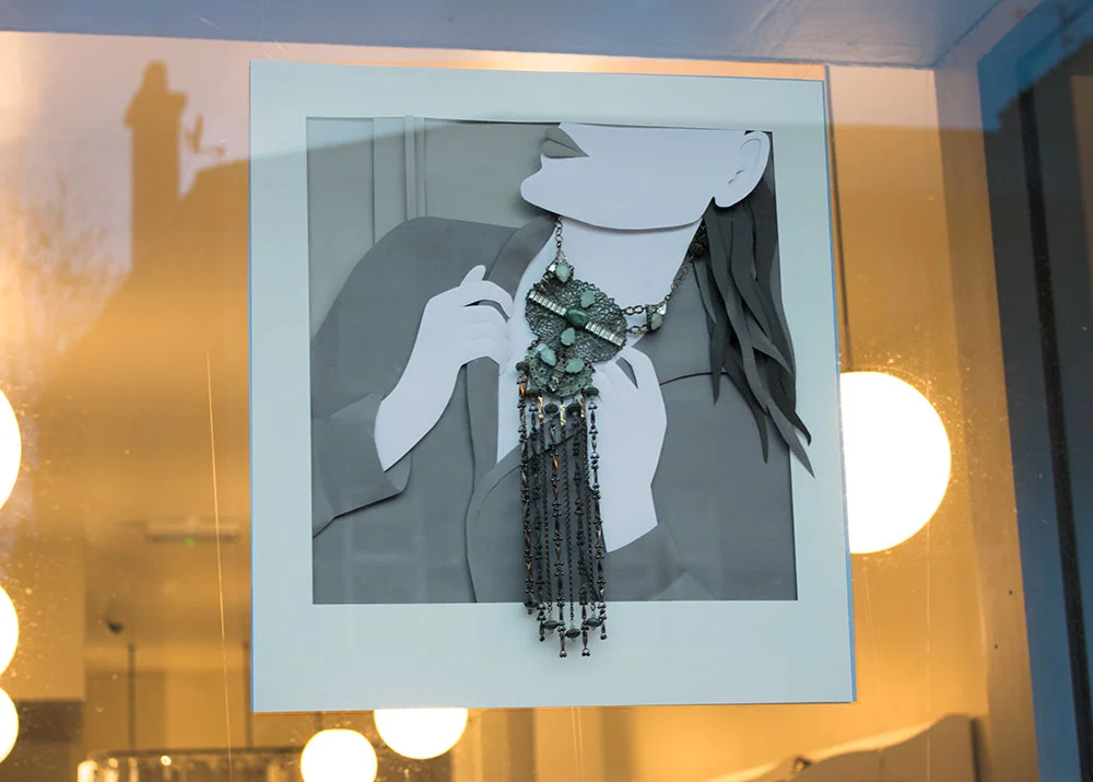 I was commissioned by Alice Kirk of Isabella's Wardrobe to create a bespoke Christmas Window display using paper art. Isabella's Wardrobe is a beautiful store based in the Westend of Glasgow which specialises in gently used luxury fashion. The window, inspired by vintage street photography, features handmade paper collages combined with real accessories.